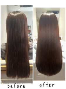 京橋店のストレートエステの施術実績 ストレートエステで艶髪に dearskyobashi 2025年5月30日 久しぶりにストレートエステをされたお客様です。根本や毛先にクセがだいぶ出ており、乾燥や広がりが気になる状態でした。 梅雨にもはいる時期なので、ストレートエステをさせていただきました。 栄養素はしっとりまとまるタイプで、お客様の髪の状態に合わせたお薬を調合しました。 仕上がりはとても艶のあるさらさらのストレートヘアに。手触りもよくとても喜んだいただけました。