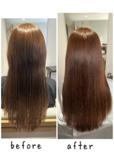 京橋店のストレートエステの施術実績 ストレートエステでまとまる髪に dearskyobashi 2025年5月30日 ストレートエステをさせていただきました。 クセが出ていてまとまりにくく、湿度が高い日は広がり困っているというお悩みでした。 しっかりと毛髪診断をさせていただき、お客様に合った栄養素とお薬を調合しストレートをさせていただきました。 毎回髪の状態は違うので、毎回お薬の調合も変えていきます。 仕上がりはとても艶のあるストレートヘアに。手触りも良く、まとまりが出たのでとても喜んでいただけました。