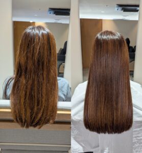 繰り返すカラーや季節の乾燥でパサついていた髪も、施術後は驚くほどやわらかくまとまり、指通りもなめらかに。色持ちも良くなるので、おしゃれがもっと楽しくなりますよ。