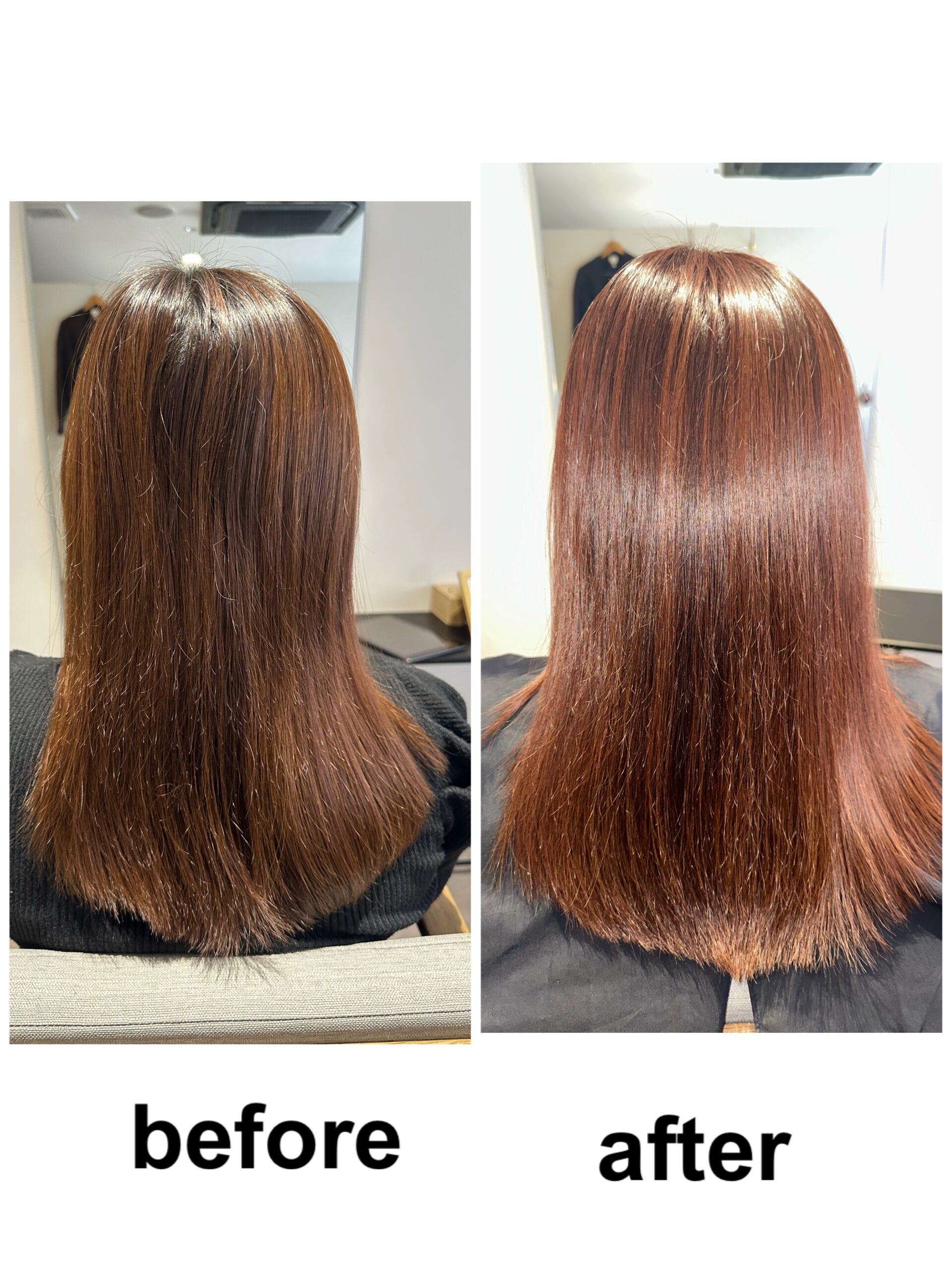 しっとりまとまりながらも、サラサラ感が出るように栄養素を調合し、カラーのお色はレッドブラウンで艶っぽく見えるようにさせていただきました。