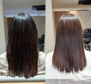 冬の乾燥で弱った髪に“芯”をつくることで、色もちが向上し、ツヤのある質感が長く続きます。特に冬カラーは深みのある色が多いため、ツヤが整うほど透明感が際立ち、仕上がりに品の良さが生まれます。