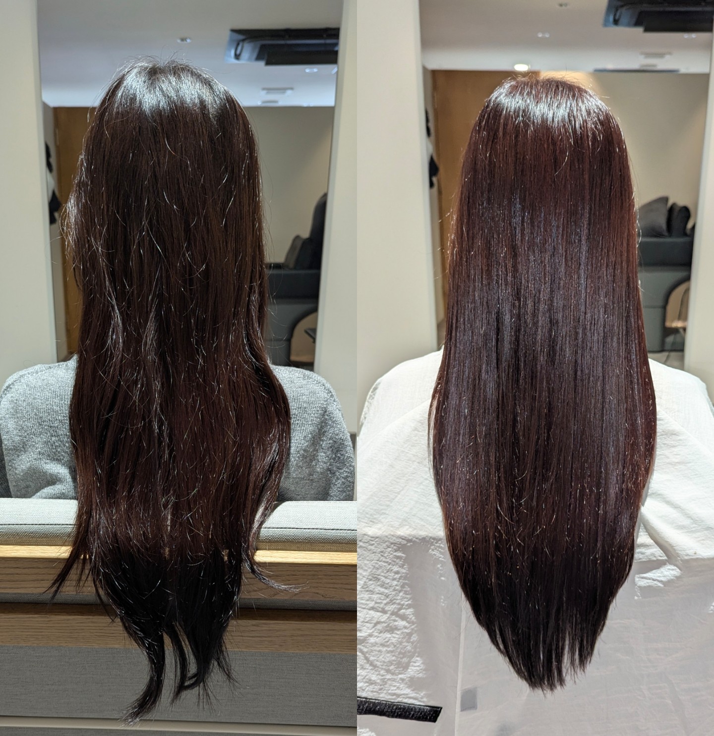 さらに、栄養を入れながら施術することで、従来のストレートのような硬い質感ではなく、指通りなめらかな仕上がりに。冬特有の静電気やパサつきによる広がりを抑え、朝のスタイリングが驚くほどラクになります。