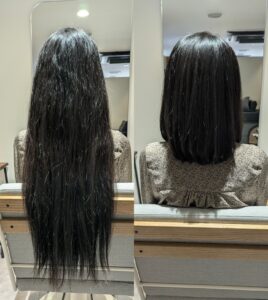 当店のトリートメントエステは、高濃度のタンパク質を補給し、乾燥によって空洞化した髪内部をしっかり補修。弱った髪に必要な栄養を丁寧に積み重ねていくことで、芯まで潤いが満ち、ふわっと柔らかい手触りへと導きます。