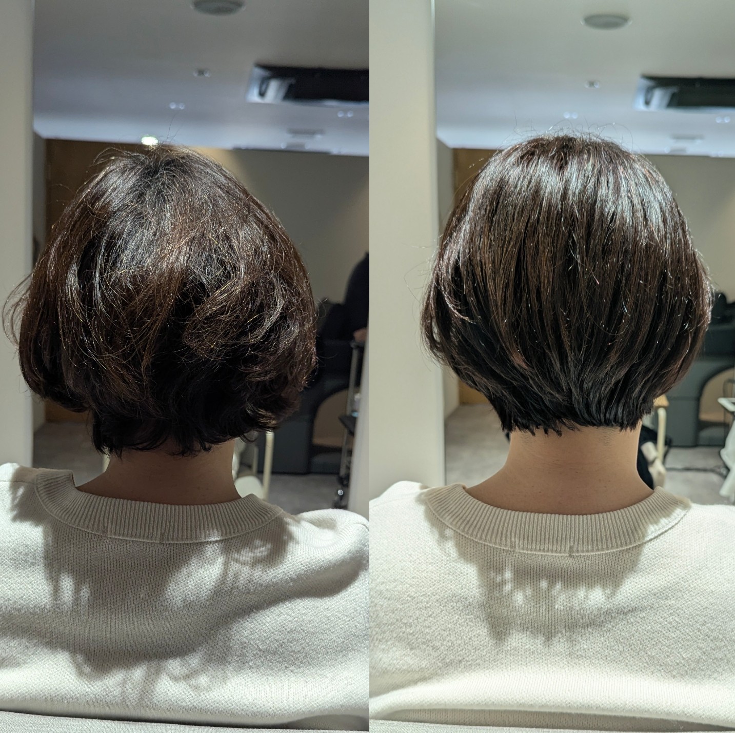 当店のカラーエステは、高濃度のタンパク質を補給しながらカラーを行う特別なケアカラー。髪の内部を補修しながら色を入れることで、毛先までしっとりまとまり、ツヤのある立体的なショートスタイルへ導きます。