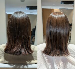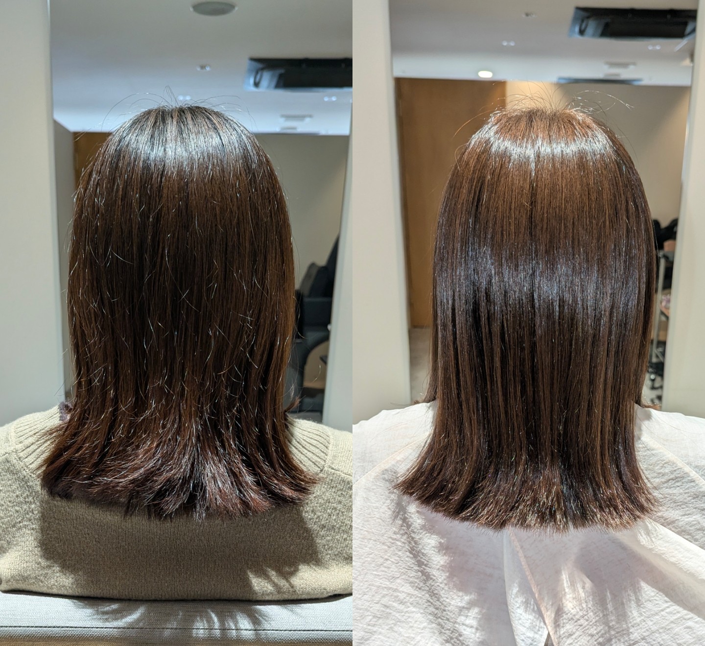 高濃度のタンパク質を補給しながら施術することで、毛先まで均一な質感に整え、軽やかさの中にもまとまりのある仕上がりを実現します。